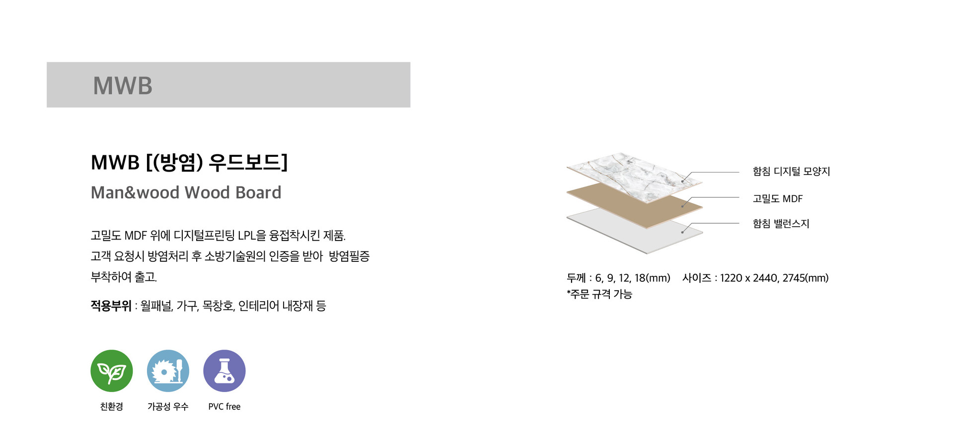 고밀도 MDF 위에 디지털프린팅 LPL을 융접착시킨 제품.
