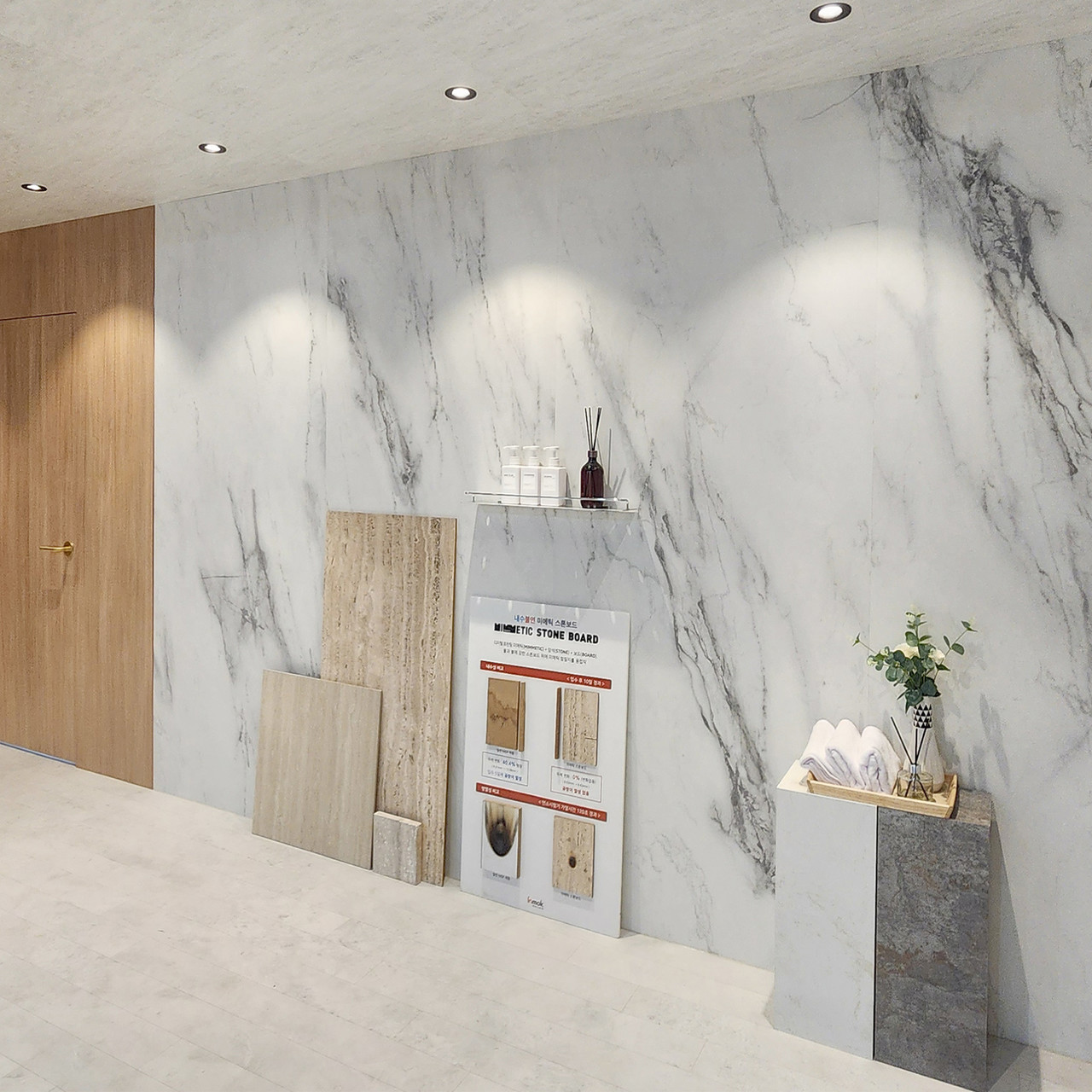 전시장에 마련된 욕실 공간 벽면은 타일 대신 스톤보드로 시공하였으며,