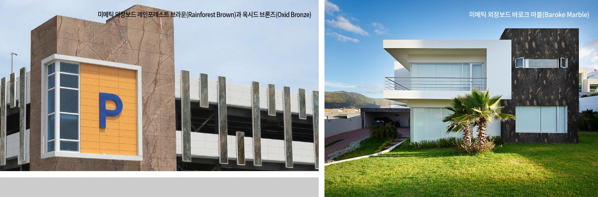 이 밖에도 미메틱 스톤보드는 건식공법으로 시공하는데 비중이 1.1 정도밖에 되지 않아 비중이 2.5~3.0인 석재나 타일에 비해 현저히 가볍고 규격도 대형으로 공급되므로 시공이 간편하고 시간도 크게 단축된다. 미메틱의 강점을 극대화하는 방향을 다각도로 모색 중인 인목은 최근 외장재 제조 전문회사와 협업해 불연방수 재질의 내충격성과 견고함이 월등한 ‘미메틱 외장보드(Mimmetic Outdoor Board)’도 출시했다. 미메틱 외장보드의 주재료는 미메틱 디지털 프린팅 페이퍼, 유리섬유, 페놀수지, 멜라민수지 및 에폭시수지 등이어서 강도와 경도 등 물성이 탁월하며 섭씨 -50~+80℃의 기후에도 견디고 태풍과 지진 등 자연재해에 의한 충격에도 안전해 주거시설, 상업시설, 관공서, 학교, 학원, 공장 등의 외벽에 사용된다.